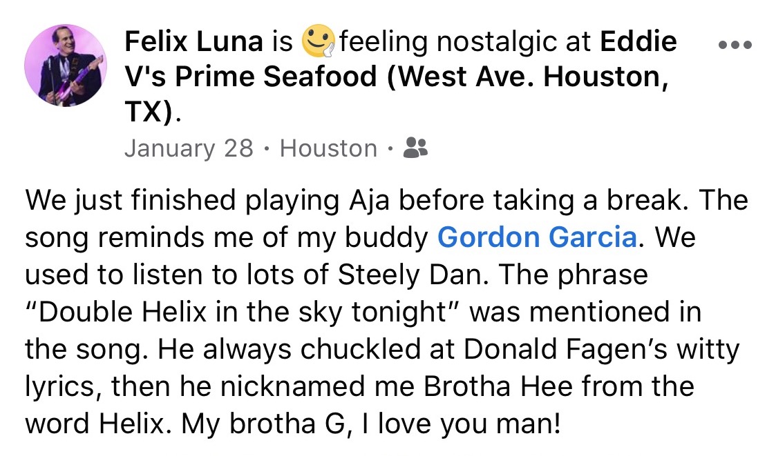 Sometimes death makes no sense. His certainly didn’t and eighteen months later I still can’t get my head around it. Having played off and on for years at a local synagogue, I thought about the Kaddish. It’s the point during the service when the congregants speak the name of someone they recently lost. Just the name, nothing else. That’s how this tribute began: by just writing his name, Gordon Garcia. From there it grew into something much longer, which I’ll now conclude in saying, Rest In Peace Brother G. We had so many more stories to share.